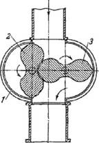 Схема швидкісного лічильника з аксіальною турбинкою показана на рис.6.6. Усередині корпусу розміщена горизонтально уздовж напрямку вимірювального потоку рідини турбинка 6, виконана у вигляді багатозаходного гвинта. Перед турбинкою установлений пристрій випрямлення потоку 1, призначений для згладжування потоку на вході і виключення завихрення. Обертання турбинки через черв'ячну пару 5 і передавальний механізм 2, розташований у камері 4, передається через сальник рахунковому пристрою 3. Для регулювання швидкості обертання турбинки в процесі тарировки лічильника передбачено регулювальний пристрій 7, що дозволяє повертати одну з радіальних перегородок пристрою випрямлення щодо напрямку потоку.